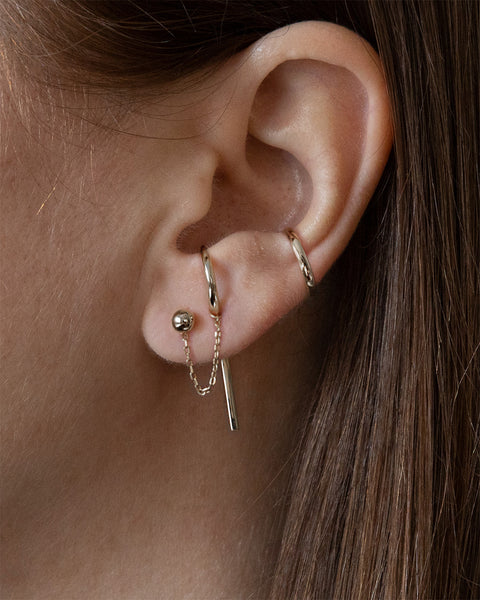A favorite way to wear all the pieces in The Silver Standard set is to pair the Ball Studs with the Chain Ear Jackets on the first piercing. On the second piercing, wear the Huggie Studs as suspenders and attach the other end of the Chains to it. Then attach the Bar Ear Jackets behind the lobe. Bonus Style Tip: Add the Essential Ear Cuff for an easy way to level up your earring look.