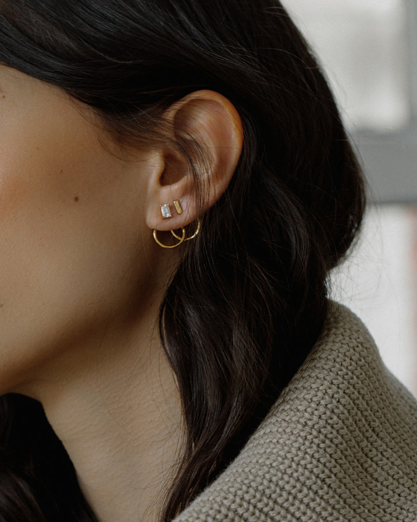 We styled the Emerald Studs and Stripe Studs with two of the Circle Hoop Ear Jackets. Layering the ear jackets behind the lobe on the first and second piercing creates this statement look.