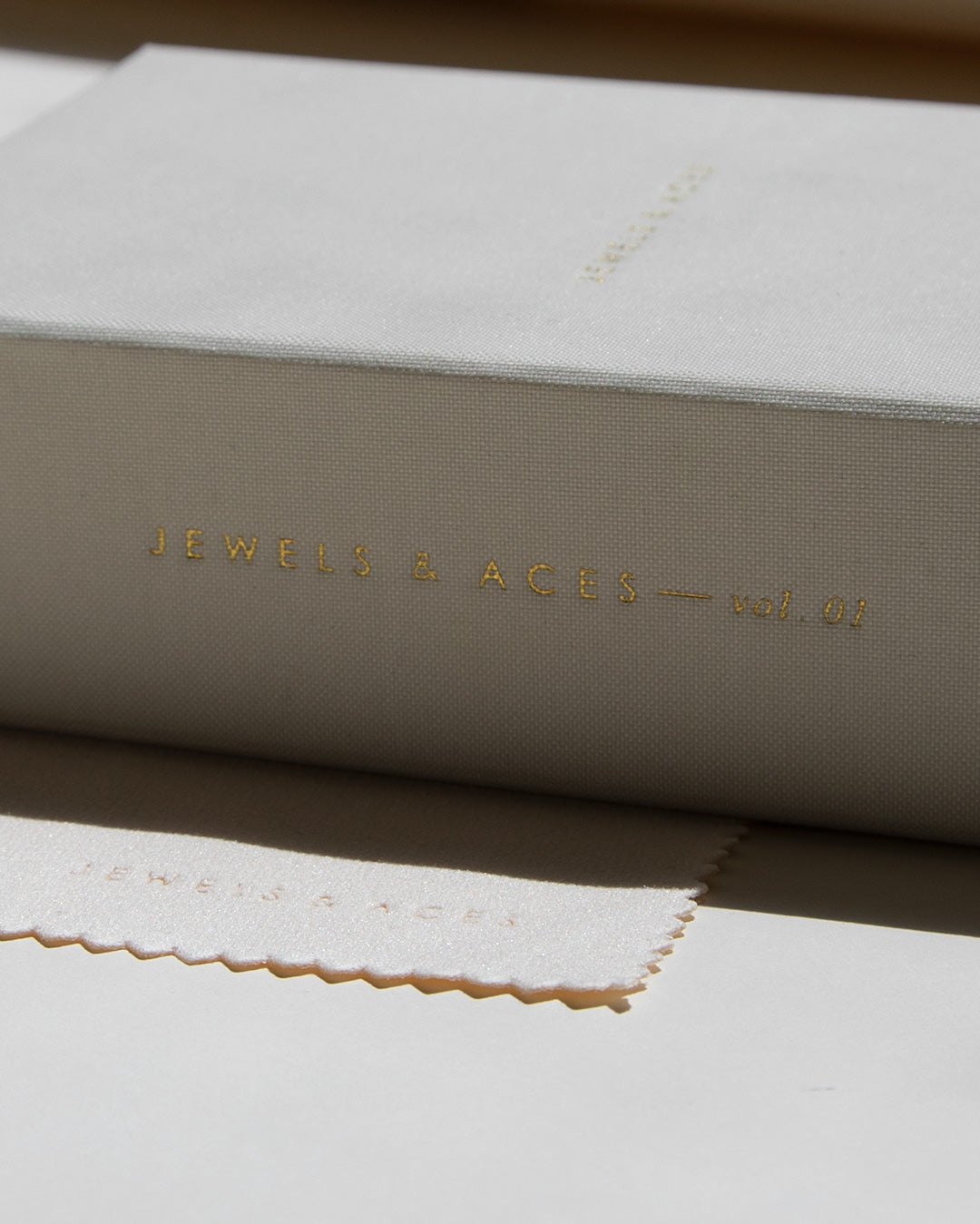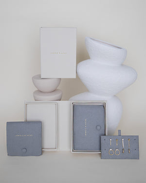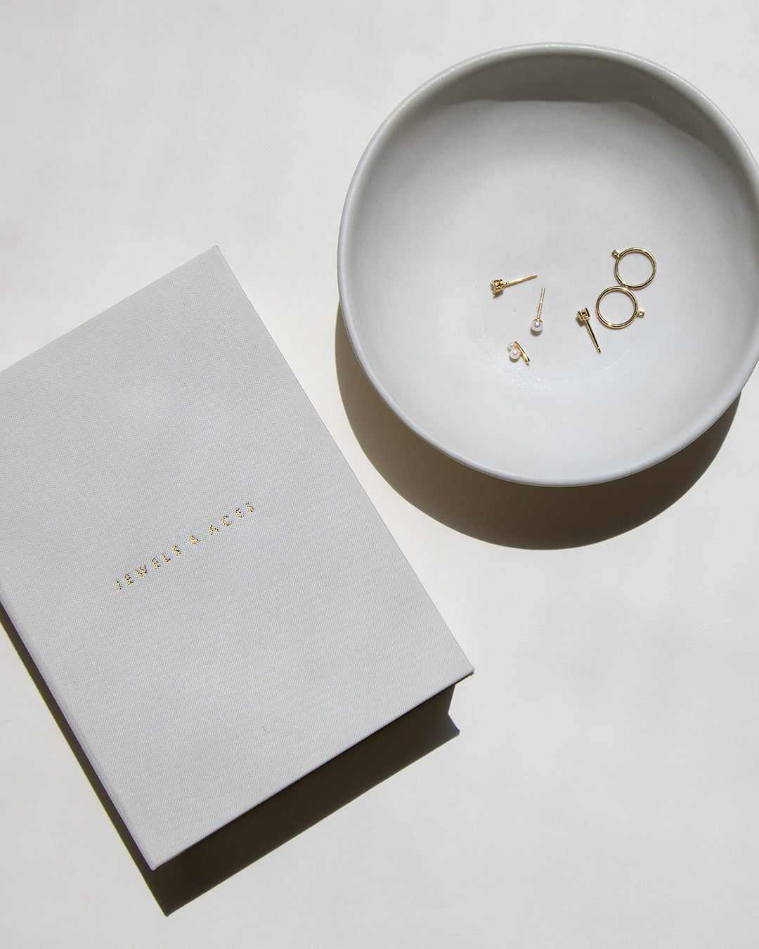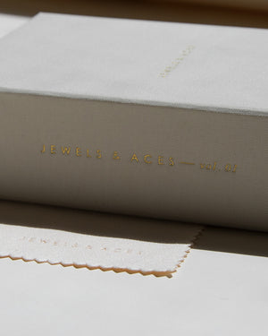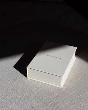 Our linen-wrapped box replicates a hard-cover book and is designed to be a delightful place to store your Earring Capsule along with room for other everyday pieces. The design was inspired by a secret hiding spot our founder had growing up, a book with a special compartment carved out for small hidden treasures.