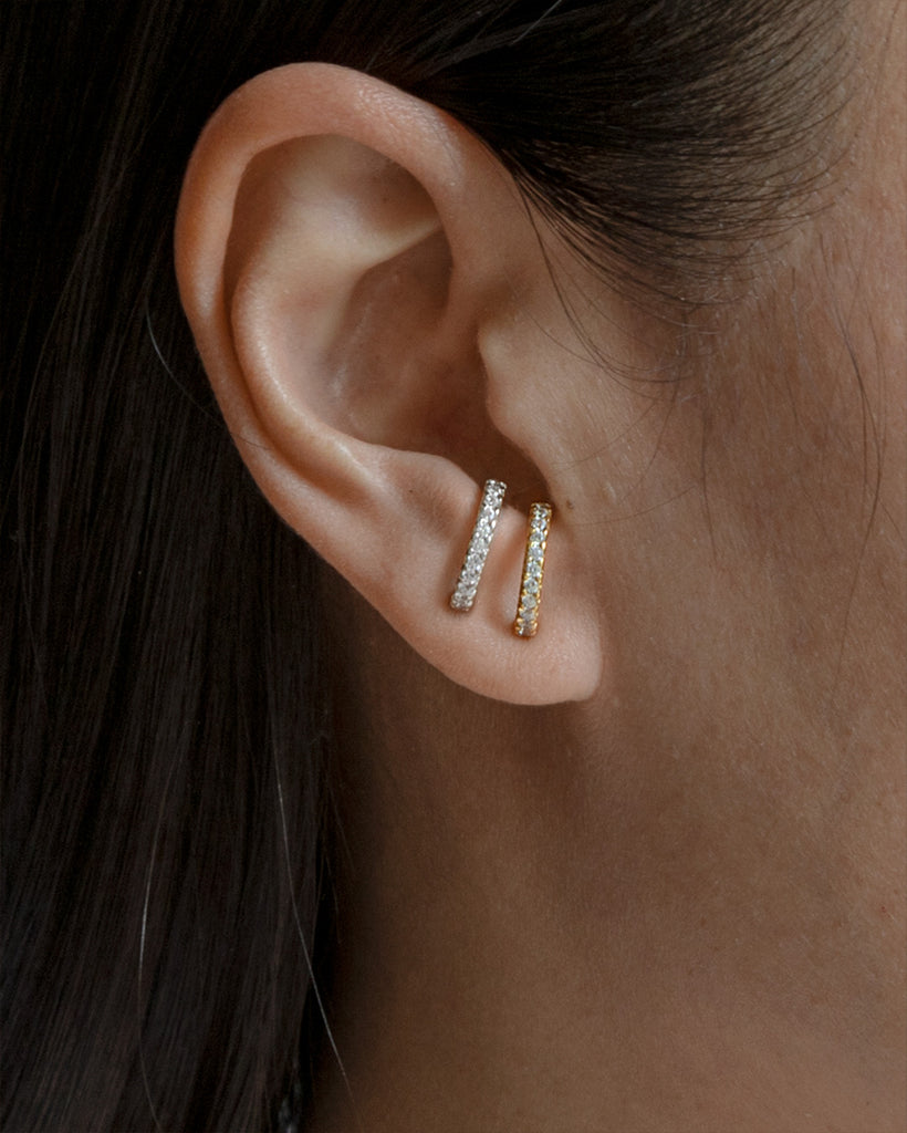 A fun way to wear the Huggies is to mix the Huggie Studs with the Pavé Huggie Studs, especially if you want some subtle sparkle.
