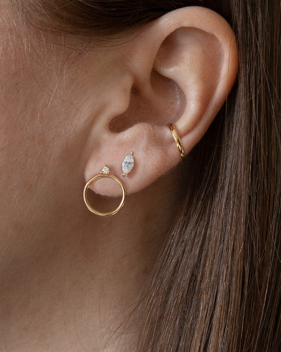 1. On your first piercing, put the Mini Solitaire Stud through your piercing and then attach the Circle Hoop Ear Jacket behind the lobe.