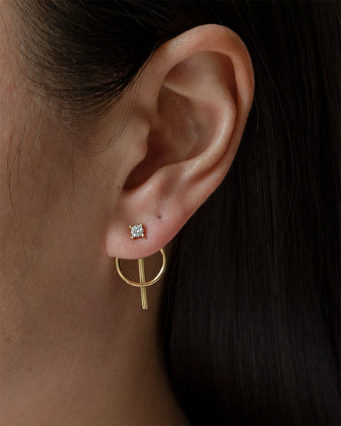 On the first piercing, wear the Solitaire Studs with the Circle Hoop Ear Jackets behind (attached behind the lobe). A perfect minimal look for any occasion.