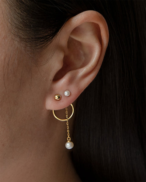 On the first piercing, pair the Balls Studs with the Circle Hoop Ear Jackets (attached behind the lobe). On the second piercing, pair the Petite Pearl Studs with the Pearl Chain Ear Jackets behind the lobe.