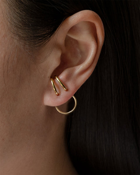 On the first piercing, wear the Trois Huggie Studs as suspenders. On the second piercing, pair the Trois Huggie Studs (worn as suspenders) with the Circle Hoop Ear Jackets. The secret behind this look is wearing the ear jackets on the second piercing and then move them down slightly so they are between the studs.
